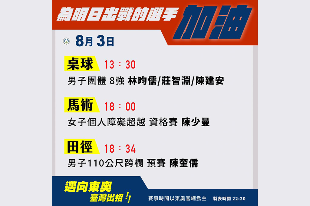 東京奧運開賽第12天,台灣至今已取得10面獎牌、排行第17名,皆創下我國在奧運的紀錄新高,更誕生不少感動的經典時刻。而今(3)日國手們將繼續在8強桌球男子團體賽、馬術女子個人障礙超越資格賽與男子田徑110公尺跨欄預賽三個項目出戰,盼再為台灣力拼亮眼表現。截至目前,已完成射箭、體操、羽球、輕艇、划船、柔道、射擊、跆拳道、游泳、網友與自由車等賽事。