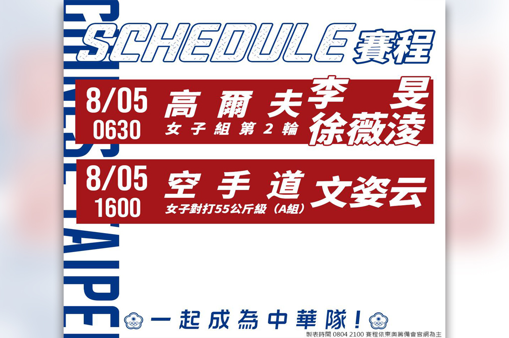 緊接著今(5)天還有精彩的賽事,讓我們繼續替台灣隊選手加油!登場的是女子高爾夫徐薇淩、李旻;空手道55公斤級選手文姿云,有望為台灣再創佳績。