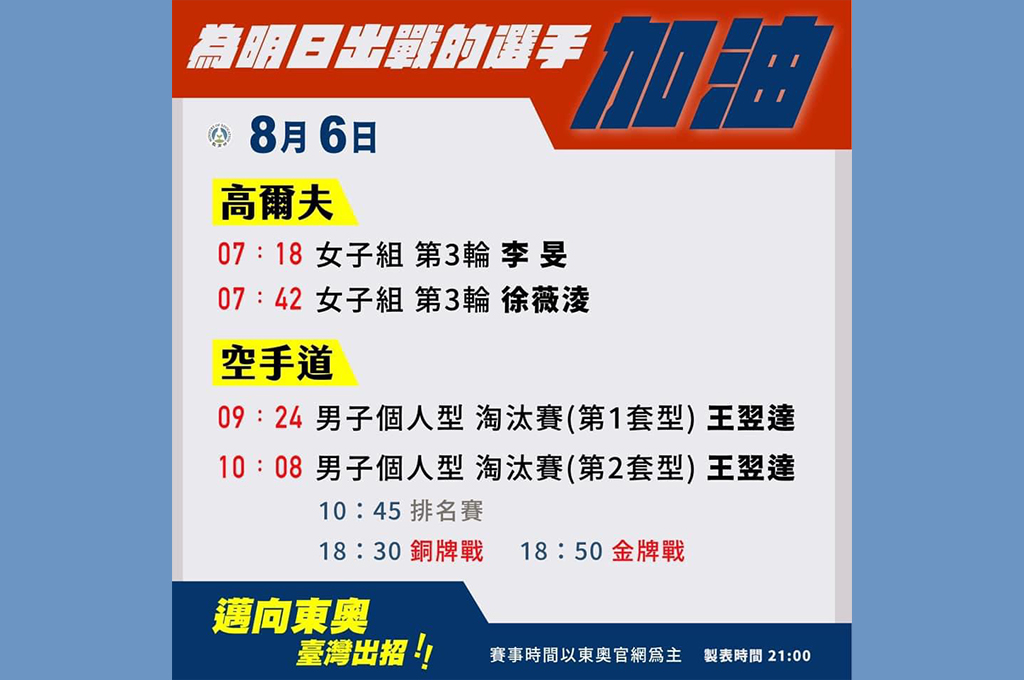 東京奧運邁入尾聲,台灣隊至今已取得12面獎牌,締造我國奧運史最佳紀錄。隨各大精彩賽事落幕,台灣參與項目僅剩高爾夫與空手道兩個項目。女子高爾夫將由並列排行第11的李旻、徐薇凌繼續出征第三輪賽事。而曾在2018年雅加達亞運奪下男子空手道「型」銀牌的好手王翌達今亮相淘汰賽力拼為台灣再搶下一面獎牌,但遺憾最終以分組第五,無緣晉級排名賽。