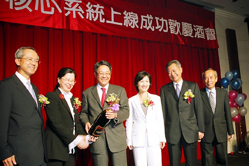 2004年4月22日,台新銀行新核心系統上線成功歡慶酒會(左至右)台新金總經理陳淮舟、惠普董事長何薇玲、台新金董事長吳東亮、微軟總經理邱麗孟、台新銀行總經理蔡孟峰、台新金資訊長何博仁。