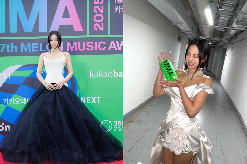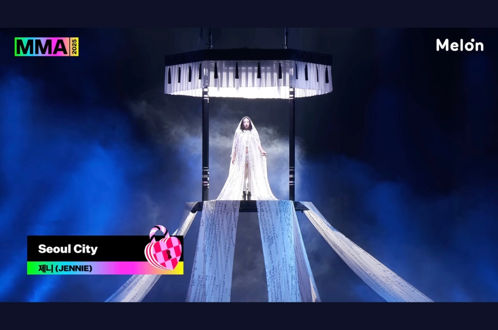 近期在《MMA 2025》舞台上,Jennie以〈Seoul City〉、〈ZEN〉、〈like JENNIE〉等三首熱曲串聯成完整表演段落,描繪她所凝視的外在世界、逐步深入的內在心境,最終抵達「完整的自己」。舞台造型大量融入韓國傳統美學元素,表演服取材「半跏思惟像」的服飾輪廓、獲頒年度唱片時穿著的禮服以「佛國寺釋迦塔」的結構比例為靈感,透過現代剪裁重新詮釋,展現力量與優雅並存的女性形象。